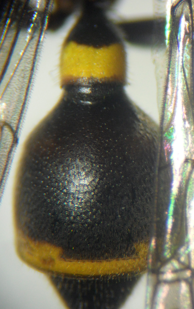 Si riconosce per il secondo tergite senza macchie rossastre, il mesoscuto con solo due sottili linee gialle e per il clipeo giallo con una larga fascia nera mediana che dal margine posteriore arriva all'apice.