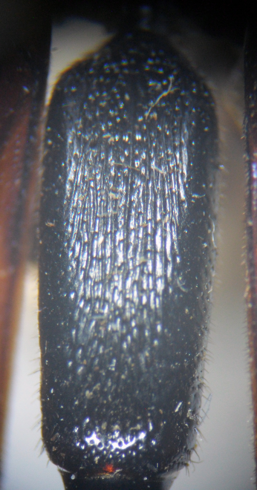 La colorazione nera con clipeo e mandibole macchiati di rosso rendono questa specie facilmente riconoscibile.