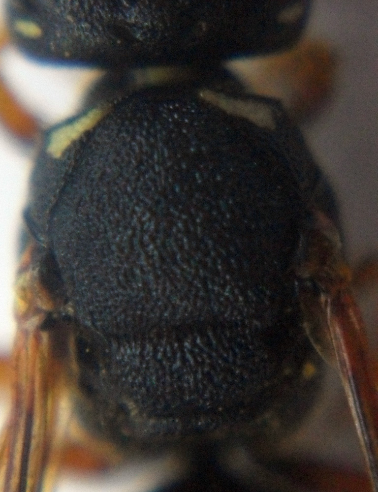 E' una femmina di Odynerus melanocephalus, specie abbastanza caratteristica per la colorazione. Il nido costruito dalle vespe del genere Odynerus è costituito da un semplice foro in una parete terrosa dal quale si diparte una sorta di comignolo fatto da fango e sassolini.