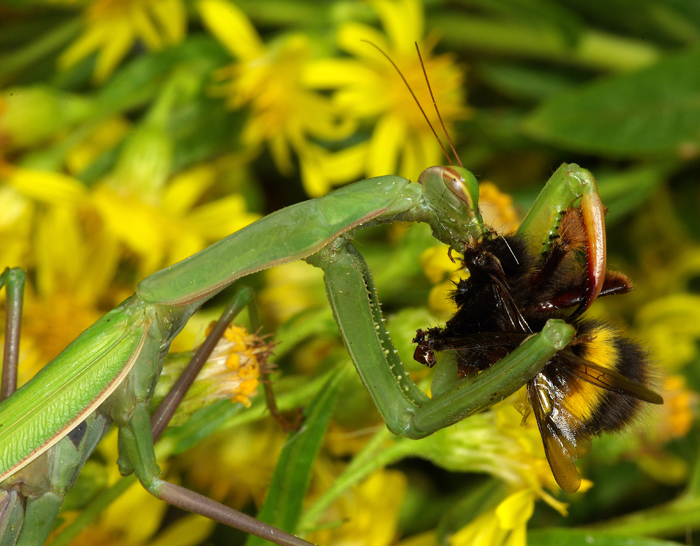 Non si può neanche mangiare in pace. Questa grossa femmina di Mantis religiosa si gustava un Bombus sp. appena catturato,....