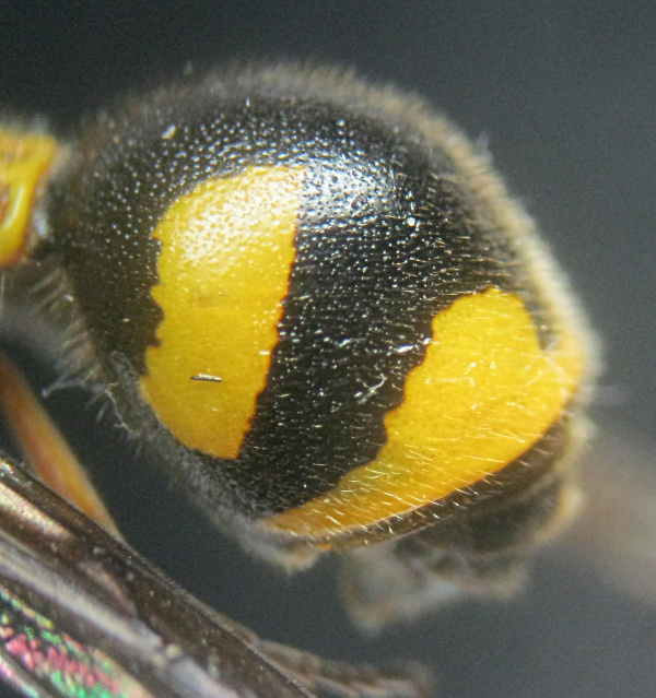 Questo esemplare potrebbe essere una femmina di Eumenes papillarius, per essere sicuri puoi dirmi se la peluria del secondo tergite è tutta corta, tutta lunga o metà lunga e metà corta?