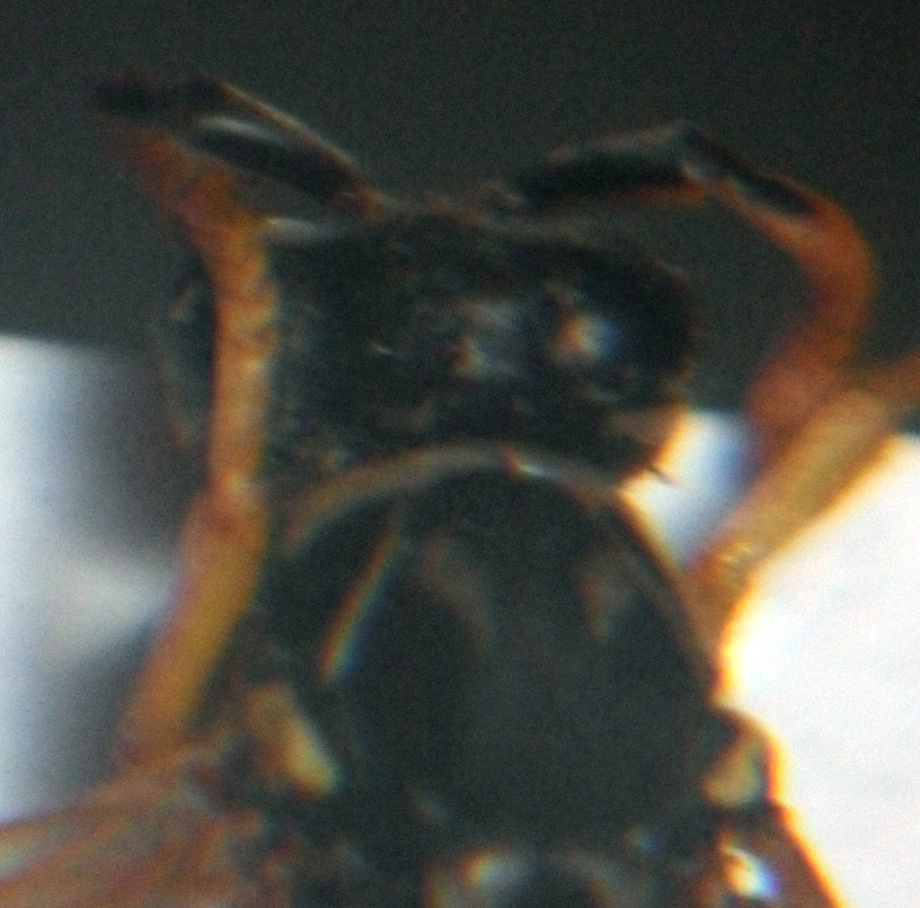 Questo maschio di Polistes non ricordo in che contesto l'ho trovato. La colorazione è alquanto strana, pensavo fossero resti della cuticula pupale, capitatami in alcuni esemplari di Polistes dominula, però sembra sia proprio la sua colorazione. Potrebbe essere Polistes dominula? 11mm |