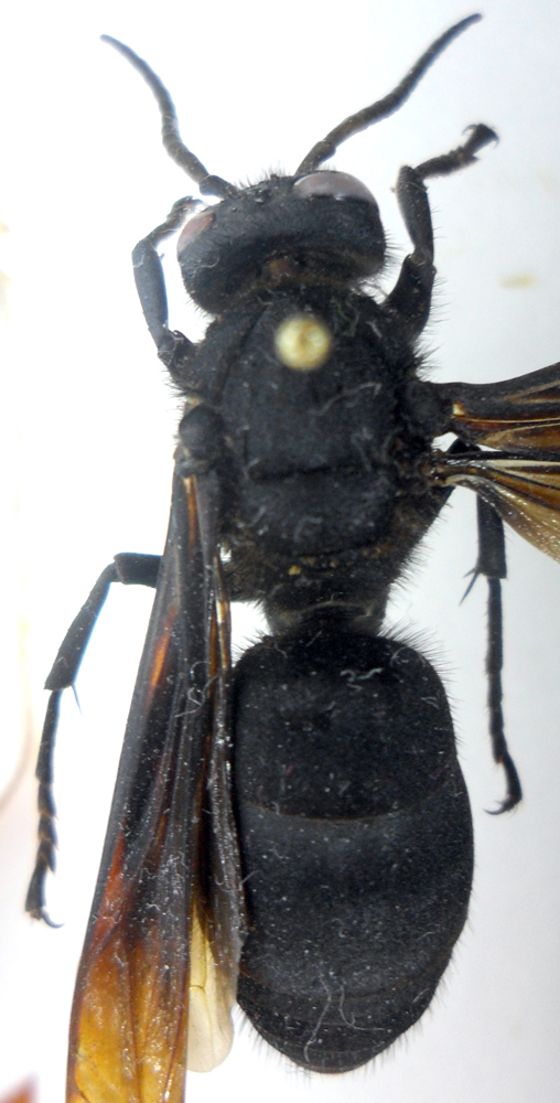 Questo bel maschio di Vespa filippino mi ha fatto dannare per arrivare alla specie. Seguendo le chiavi ho incontrato infatti vari problemi, ad esempio un passo chiedeva se l'occhio sinistro è a contatto o meno con il clipeo e io ero sicurissimo fossero a contatto, solo un crop di una foto mi ha fatto vedere che era presente una sottilissima striscia che li separava. Risolti i vari problemi arrivavo a V. tropica che però è caratterizzata dal secondo tergite arancione, quindi l'esemplare è rimasto fino ad ora determinato come Vespa sp. Oggi per caso ho ritrovato nel mio archivio un lavoro che include una chiave per le sottospecie/varietà di V. tropica e ho scoperto che l'esemplare appartiene alla varietà anthracina che è tipica delle Filippine e completamente nera :no1: