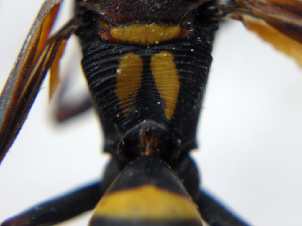 Polistes strigosus è caratterizzata dal pronoto e dal propodeo fortemente striati quindi si può riconoscere facilmente. Questo esemplare in particolare è un'operaia appartenente alla sottospecie mimus, sottospecie diffusa in Nepal, Malesia(Sabah) e Filippine(Sibuyan, Luzon e Mindanao) e con colorazione molto diversa da quella nominale che è uniformemente rosso-bruna. Tra qualche tempo mi arriverà anche un maschio che provvederò subito a fotografare.