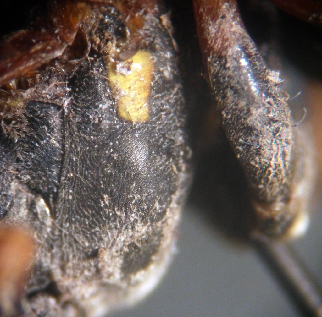 Polistes versicolor è una bella specie sud-americana che conta 3 sottospecie: flavoguttatus in Ecuador, Perù e Bolivia; kaieteurensis in Guyana e a Rorarima in Brasile; versicolor in quasi tutta l'America latina. Questo esemplare appartiene alla sottospecie nominale. 20mm Può essere riconosciuta per la combinazione dei seguenti caratteri. Mesoscuto rosso-ferrugineo Mesopleure non punteggiate o con pochi punti finissimi e quasi interamente nere Propodeo nero con due linee gialle Tergiti I-II con macchie gialle Primo tergite che si alza bruscamente, quasi perpendicolarmente, dopo il punto d'inserzione del legamento sospensorio. Purtroppo il modo in cui ho preparato l'esemplare non mi ha permesso di fotografare decentemente questo carattere. |