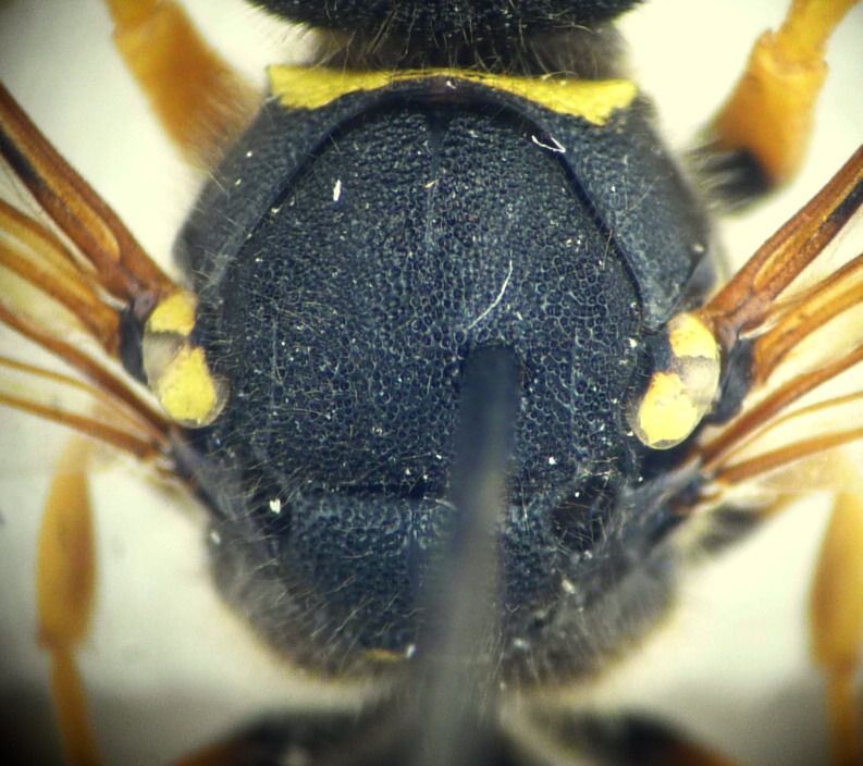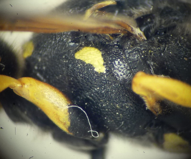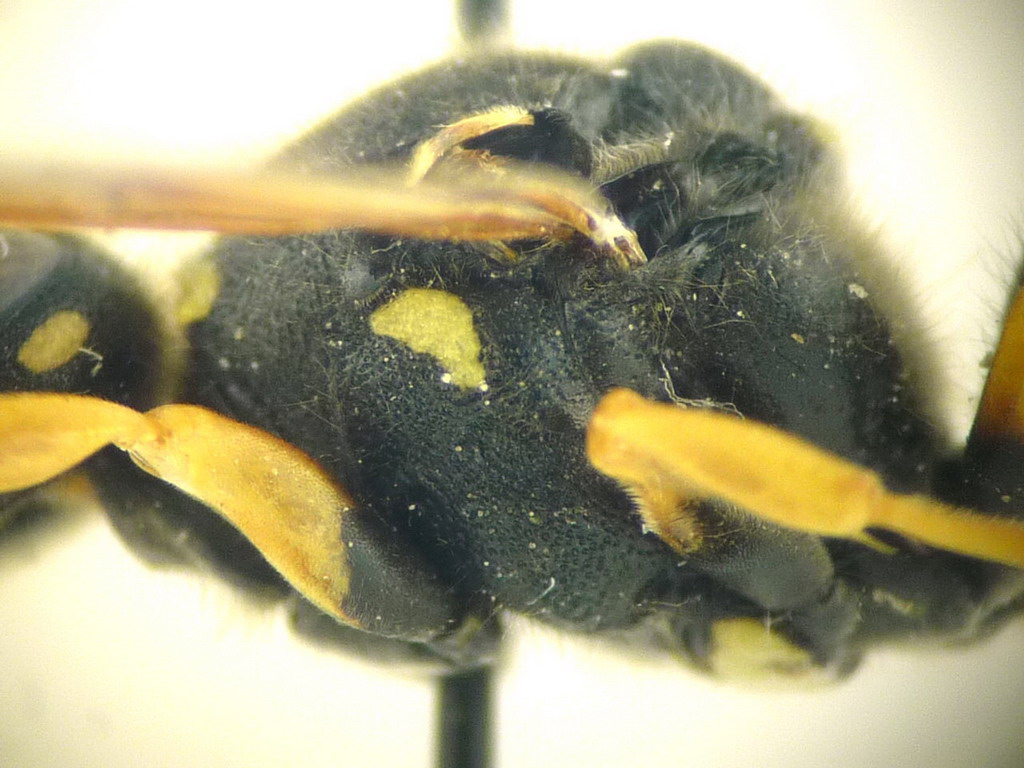 Il mesoscuto è fittamente punteggiato senza interspazi lisci e lucidi quindi Gymnomerus può essere escluso. Non capisco però se la mesopleura presenta nella zona ventrale una carena verticale( carena epicnemiale): se è presente è Paragymnomerus spiricornis, se è assente è un Odynerus.
