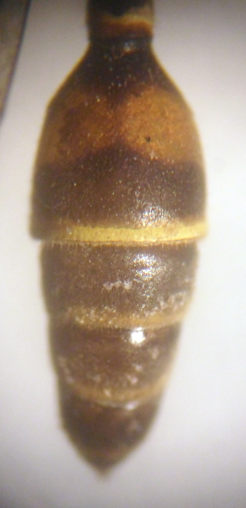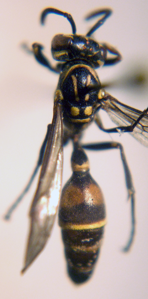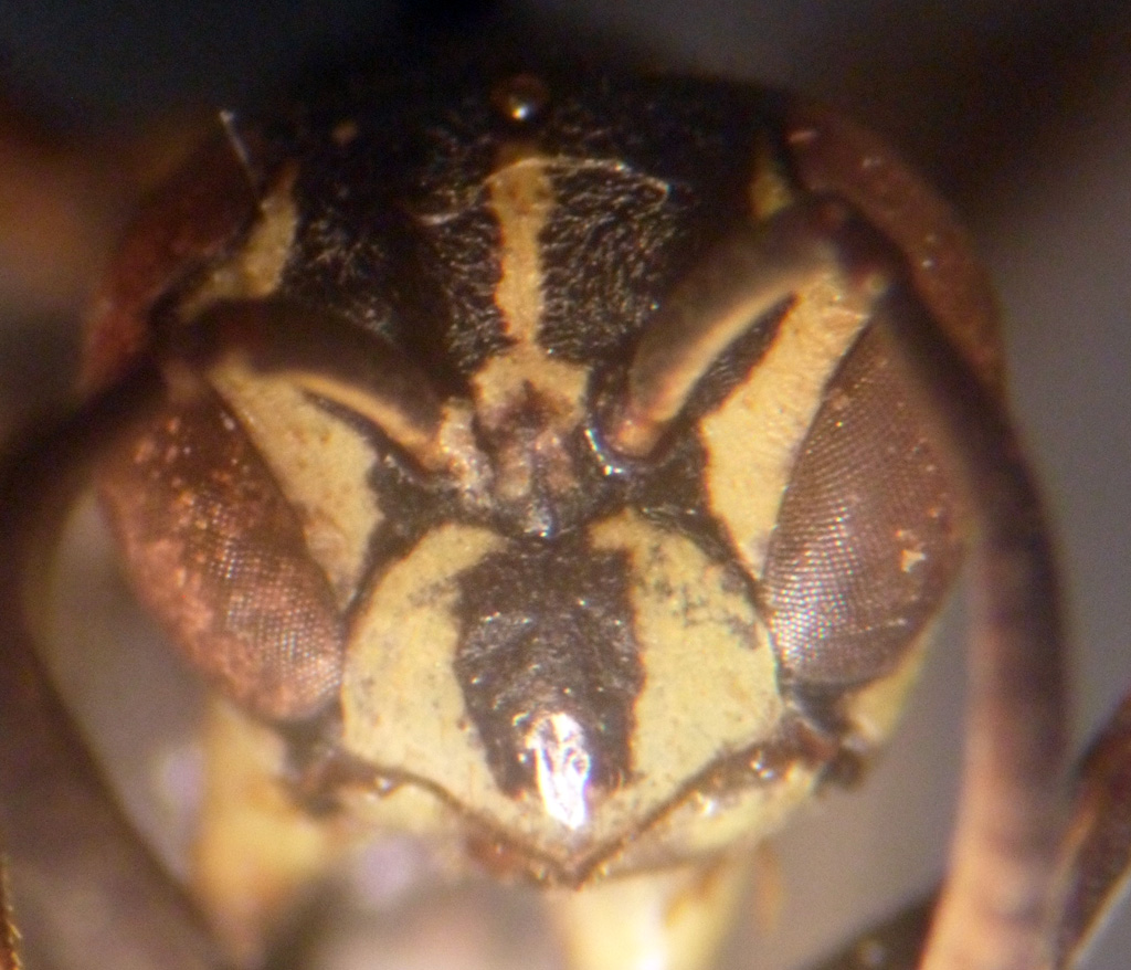 Questa specie si distingue per il clipeo con una macchia nera, il mesoscuto con 2 linee gialle, il secondo tergite con una fascia bruno-rossastra e per il propodeo con una fascia nera laterale(che ho indicato con una freccia bianca).
