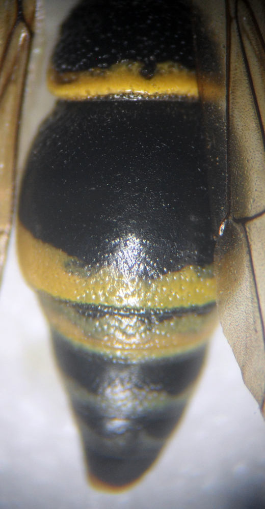 -tutti i tergiti, eccetto l'ultimo, presentano una fascia apicale gialla, le tibie sono gialle e le mesopleure presentano gli interspazi tra i punti ampi e lucidi, quindi può essere confermato S. crassicornis mentre si esclude S. angustatus che ha solo i tergiti 1,2 e 4 fasciati di giallo, le tibie nere e le mesopleure hanno interspazi stretti e coperti da punti più piccoli.
