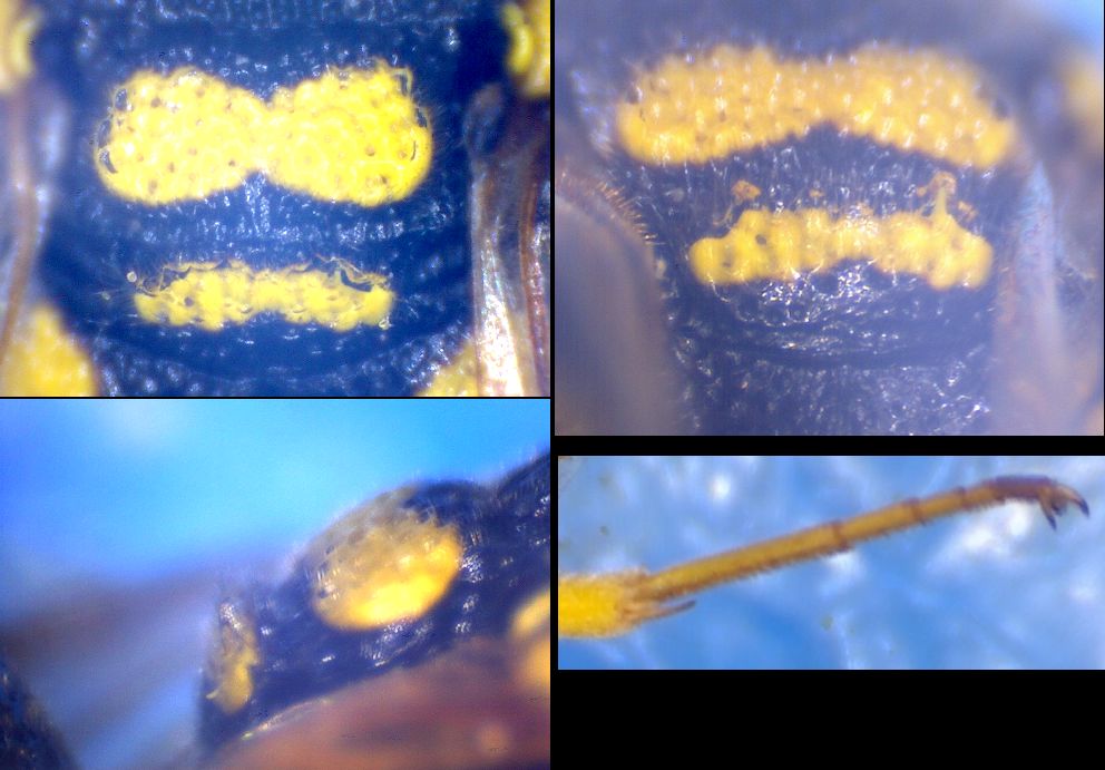 Ora sono andato a rivedere la bestiola ebbene, al margine anteriore della sottile banda gialla orizzontale visibile sul tratto orizzontale subito al davanti dell'area centrale del propodeum (su quello che ho sempre chiamato post-scutellum), è presente una sottile cresta festonata che ai lati assume l'aspetto di due minuti denti.