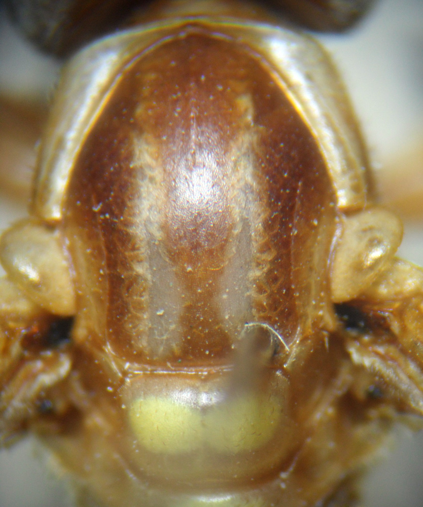 Ecco un altro degli esemplari che sto determinando per il Museo di Storia Naturale di Venezia. Apoica strigata è una specie che si riconosce per il mesoscuto con due linee chiare longitudinali e per l'addome marrone chiaro con delle linee apicali giallo-bianche su tutti i tergiti. Può essere confusa a prima vista con A. arborea, ma quest ultima specie presenta il colore di fondo più scuro e i disegni gialli più accesi, inoltre la femmina non presenta mai le linee gialle sul mesoscuto. 13mm all'apice del secondo tergite |