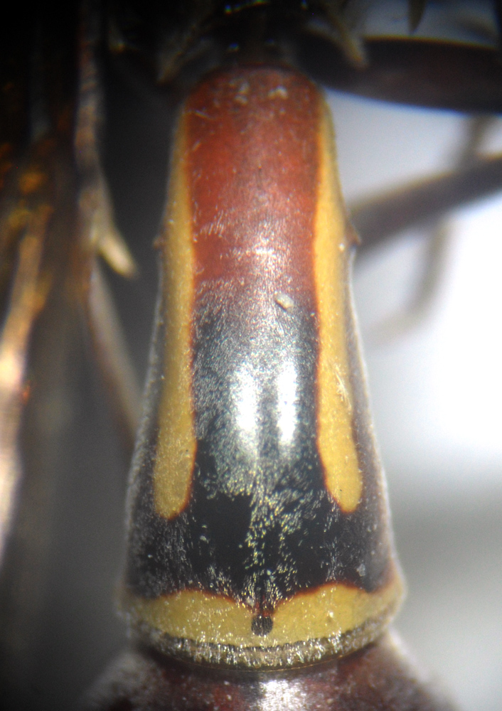 Ho finalmente iniziato a determinare il fantastico materiale preso a Modena, quindi vi tormenterò per un po' con le specie più interessanti Pareumenes sansibaricus è una bellissima specie africana caratterizzata da testa e torace dall'aspetto vellutato e ricoperti da una densa pubescenza argentea. Conta diverse sottospecie, alcune conosciute solo di piccole zone. La sottospecie laetefasciatus è presente in Etiopia e Somalia ed è caratterizzata dalla grande estensione dei colori giallo e rosso. 17mm all'apice del secondo tergite |