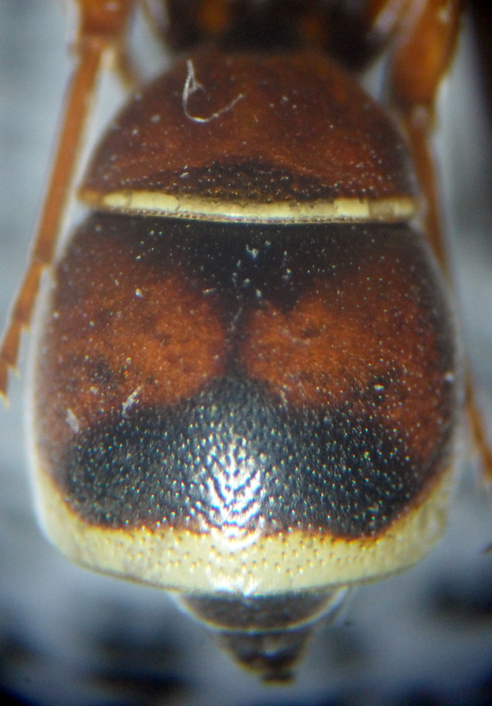 Si riconosce per il secondo sternite poco sporgente alla base, le carene propodeali assenti e il propodeo quasi interamente liscio con pochissimi punti. Anche la bellissima colorazione è molto caratteristica.