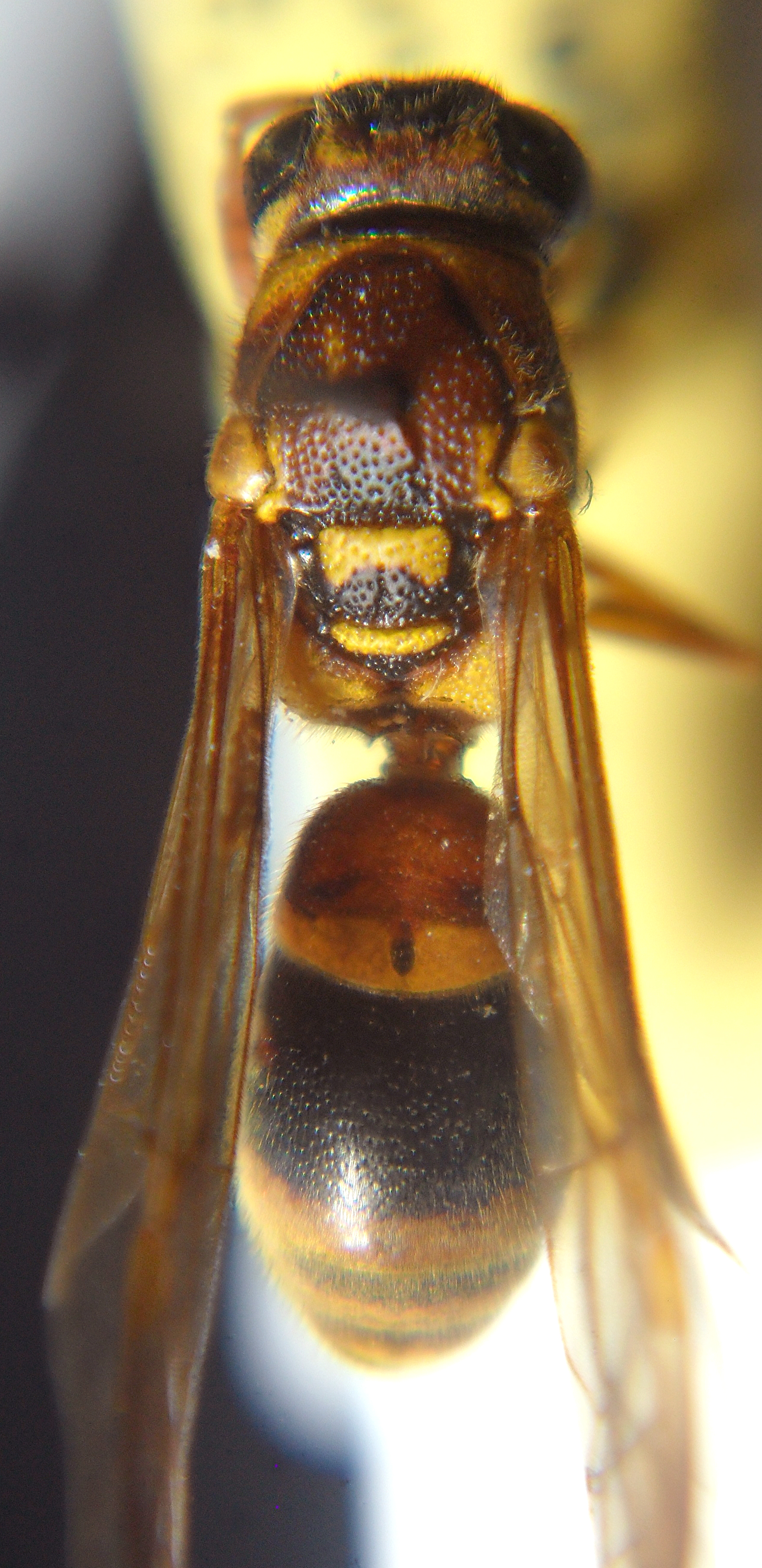 Di questa specie ho già inserito la pubblicazione qui, ma visto che sto risistemando alcune foto, tra cui quelle della nuova specie, ne approfitto per aprire anche una discussione su di essa. Come detto nella pubblicazione questa specie presenta una caratteristica che la accomuna a solo due delle oltre 50 specie di questo genere: la presenza di setole sulla superficie dell'occhio. Questa specie è riconoscibile dallo S. boholensis per i seni oculari piatti e da S. laevis per la scultura di clipeo e propodeo e per la maggiore quantità di peli oculari, inoltre presenta una colorazione rossa e gialla molto più estesa. Inoltre le altre due specie sono endemiche delle isole Filippine, mentre S. rufoflavus è endemico di Sulawesi. 11mm all'apice del secondo tergite |