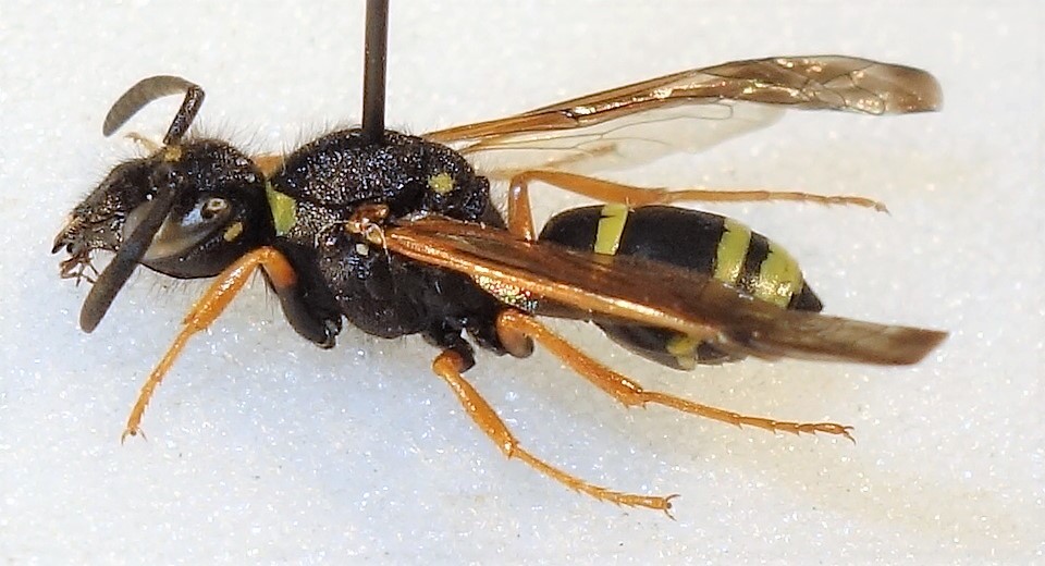 Ciao Gianpaolo, è una femmina di Odynerus (Odynerus). Mi controlli i seguenti caratteri? -peluria su testa, torace e primo tergite nera oppure bionda; -scapo antennale nero o con una fascia gialla sul lato ventrale; -spazio tra occhio e inserzione dell'antenna nero o con una corta linea gialla; -margine apicale del clipeo incavato oppure troncato; -tibie mediane gradualmente ristrette dall'apice alla base oppure subparallele e poi fortemente assottigliate alla base; -disco del secondo sternite con interspazi lisci e lucidi oppure finemente reticolati. Le specie probabili sono due e le ho entrambe, se ti servono foto per confrontare i caratteri fammi sapere