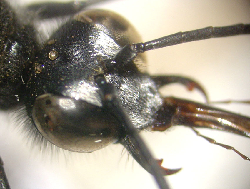 Siniscola (Monte Albo) 28 giugno 2009 - é un maschio - l'apice del primo sternum raggiunge e ricopre la base del secondo - unghie semplici prive di denti - area dosale del propodeo grossolanamente punteggiata con lunghi peli chiari - tempie con peli neri - prime 3 tergiti di colore rosso - pulvilli ben sviluppati A meno che non abbi preso una cantonata (Ammophila?) a mio avviso sono possibili 2 specie: Podalonia hirsuta hirsuta e Podalonia tydei. Darei la preferenza alla hirsuta (sottospecie nominale), nonostante Pagliano non la riporti per la Sardegna, per la pubescenza delle tempie vistosamente nera (binaca nella tydei), per le antenne prive di tyli (delle deformazioni cordoniformi sui flagellomeri), per i pulvilli ben evidenti tra le unghie tarsali ed infine perchè ne ho catturato una anch'io che é stata determinata come tale dagli amici francesi. Aspettiamo il parere di Maurizio Mei! al binoculare |
