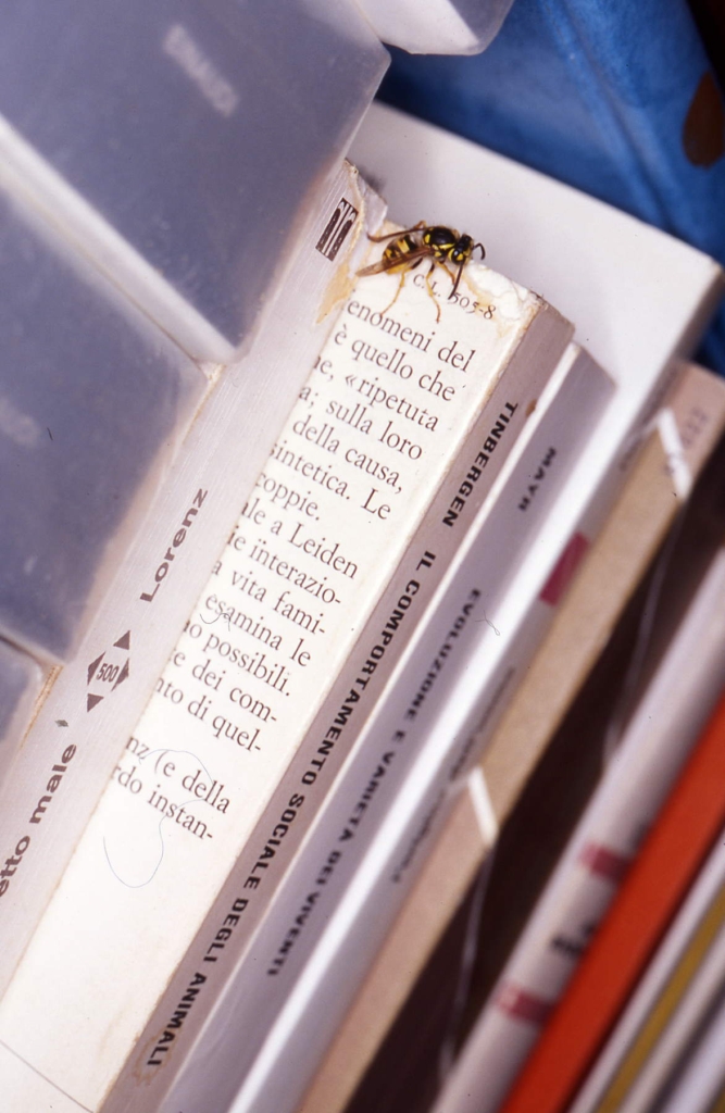 Resto in tema (almeno nello stesso Ordine): qualche anno fa ho fatto questa foto a uno scaffale della mia libreria, e la propongo perchè mi sembra curiosa. Su che libro va un imenottero sociale a procurarsi un po' di fibre per il nido?