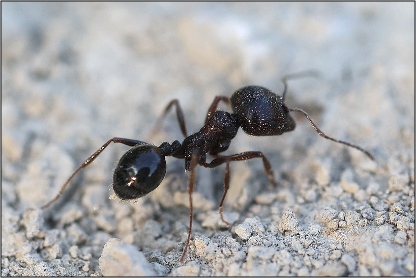 Ieri mentre cercavo di fotografare delle vespine indaffarate ad entrare ed uscire dal terreno, sono stato attratto da alcune formiche completamente nere. Due di diverse dimensioni, immagino della stessa specie ma con mansioni diverse, erano "abbracciate" nei pressi del formicaio in un atteggiamento apparentemente tranquillo (vedi foto), poi la più grande se n'è andata. Nei dintorni c'erano operai indaffarate a portare semi di acero verso il formicaio. Mi sapreste dire di chi si tratta?