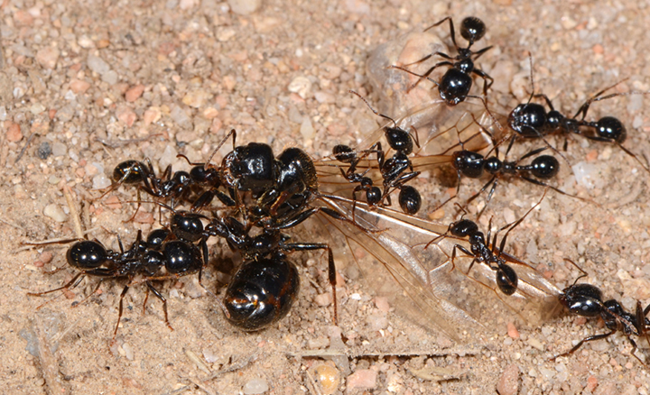 Ho assistito e fotografato questo caso di aggressività tra formiche. Un sessuato alato, mi sembra di Messor, (si può capire la specie?) è atterrato nei pressi dell’ingresso di un formicaio, e si è diretto decisamente verso di esso come se intendesse entrarci. Immediatamente le operaie del formicaio l’hanno assalito e rapidamente ucciso. Il comportamento delle operaie mi sembra normale, un estraneo anche se conspecifico (a proposito, sono della stessa specie?) se si avvicina all’ingresso viene aggredito. Quello che non sembra normale è il comportamento della mancata regina: perché mai ha cercato di entrare in un formicaio già occupato invece che cercare un posto tranquillo dove fondare una nuova colonia?