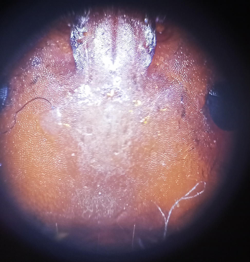 O,k now are visible setae on occipital part of head but no setae on gena. They are white and you shoud be prepare photo of head on the dark background (black or dark grey not white). In area between eyes and base of mandible should be visible short bright, erect setea. This is the main character wich distinguished C. pilicornis from another common Spanish species C. sylavticus which has gena without setae. Both species are extremely variable in colour, from mostly yellow to almost dark brown.