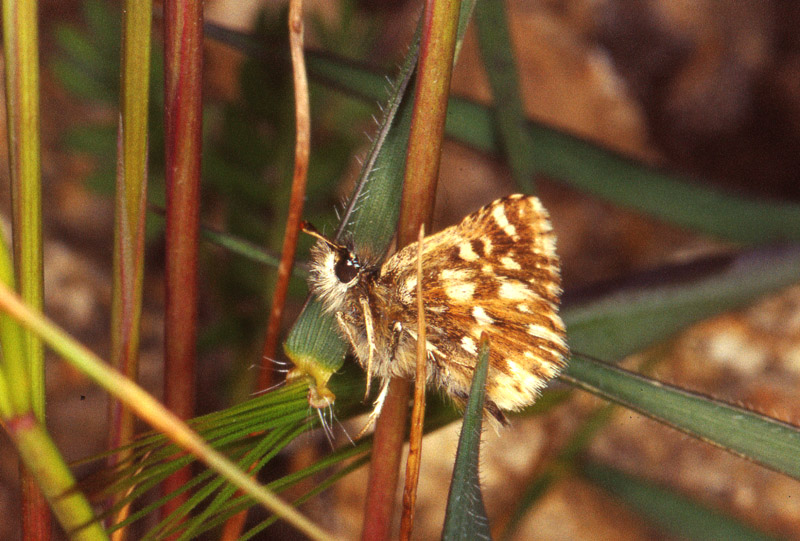 Come avevo promesso nella discussione su Carcharodus alceae aperta da Pietro, posto qualche foto di Spialia therapne, l'unica specie che in Sardegna può confondersi con C. alceae. Già a prima vista rispetto ad alceae è evidente che le macchie bianche sono più grosse e più numerose, inoltre è mediamente specie più piccola. Invece la distinzione da Spialia sertorius credo sia molto poco agevole dalle semplici foto, distinguendosi le due specie per pochi particolari: therapne è più piccola, le macchie del retro delle ali, bianche in sertorius, sono giallastre in therapne, e infine quest'ultima ha la macchia discale del retro delle ali anteriori più quadrangolare. comunque, in Sardegna c'è solo therapne, perciò poca possibilità di confusione. Qualcuno ritiene therapne specie valida, altri sottospecie di sertorius.