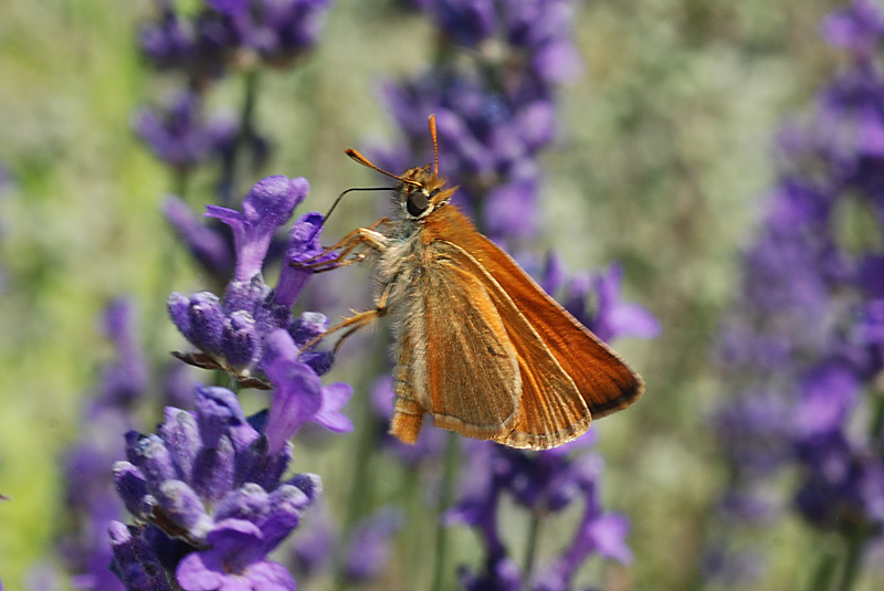 Questo invece sembra che non abbia le antenne ad uncino (ma forse ci vorrebbe una foto in vista frontale che non ho!), nessuna macchietta evidente e colori verdastri, quindi potrebbe essere Thymelicus acteon.