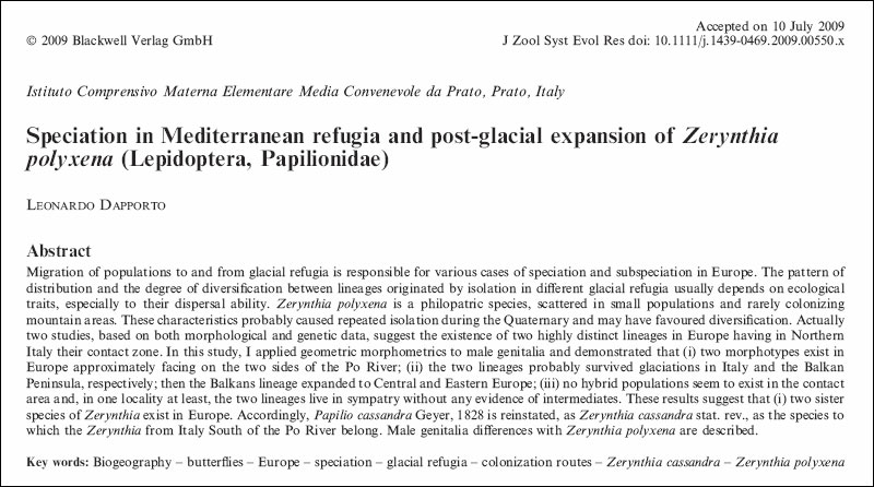Speciation in Mediterranean refugia and post-glacial expansion of Zerynthia polyxena (Lepidoptera, Papilionidae). Leonardo Dapporto, 2009; Journal of Zoological Systematics and Evolutionary Research - Wiley InterScience
