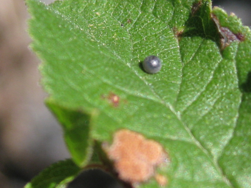 La pianta nutrice non l'ho ancora determinata (per pigrizia), comunque ci sono uova in due diversi stadi di maturazione e una larva neonata di... ???