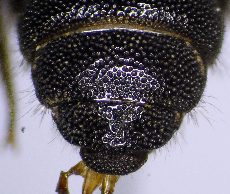 Il maschio si riconosce per la colorazione nera con l'apice di alcuni tergiti con una fascia chiara traslucida, la punteggiatura del clipeo molto più fine e densa del resto della testa, il sesto tergite con al centro degli ampi interspazi lucidi e il quarto sternite con una depressione a V nel centro.