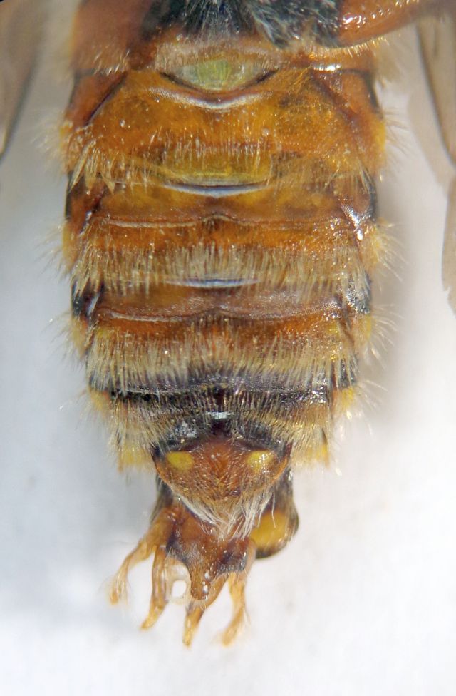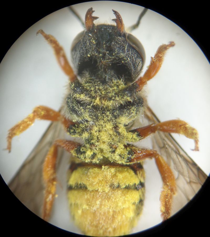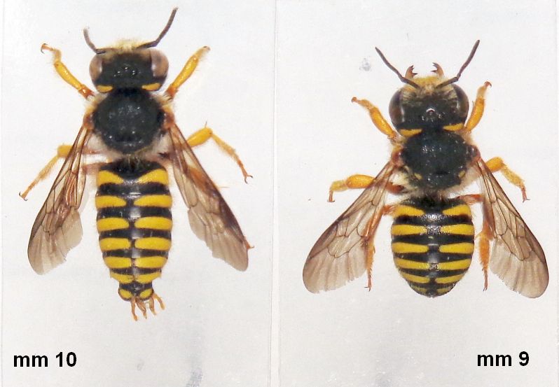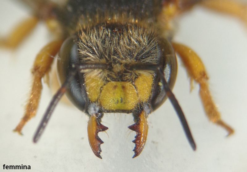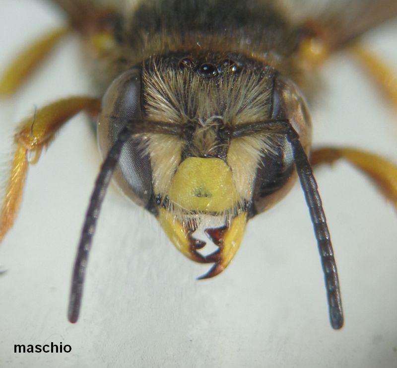 Infatti anche questi sono Anthidium oblongatum. Oltre al grosso dente basale delle mandibole, un carattere peculiare è lo scutello con due protuberanze al margine posteriore. In altri generi di Anthidiini (es. Icteranthidium) sono le axille, i due scleriti ai lati dello scutello, a presentare il margine posteriore angolato, mentre in questo caso le axille sono arrotondate e lo scutello è dentato.