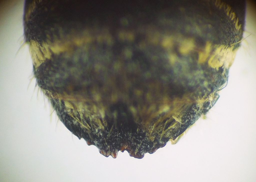 Sono in dubbio fra Xanthosarus ed Eutricharaea, perchè il mio esemplare mi sembra abbia caratteristiche intermedie. Le mandibole sono trifide, il T7 ha un minuscolo dentino (non saprei dire se il T7 sia visibile o meno, si vede solo in visione ventrale), l'S4 non ha un membrana ialina come negli esempi del lavoro, ma c'è un bordo più sottile e chiaro. I tarsomeri anteriori vanno dal nero del basitarso all'arancione degli ultimi tre, infine il T6 è glabro sul disco. Non può essere M. giraudi, unica Eutricharaea col disco glabro del T6 perche avrebbe il basitarso anteriore modificato con una proiezione sul tarsomero seguente, e non può essere M. lagopoda e M. maritima, uniche Xanthosarus con le mandibole trifide, perchè i maschi hanno i tarsi anteriori molto larghi. Boh!
