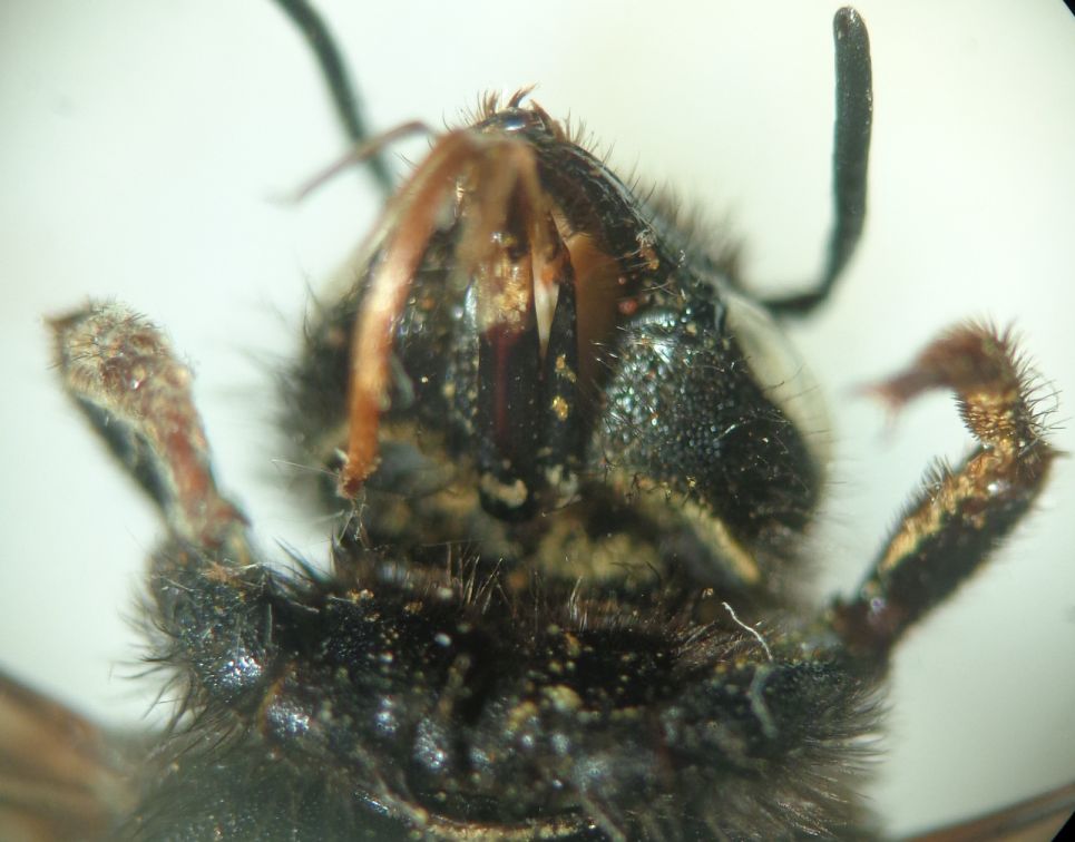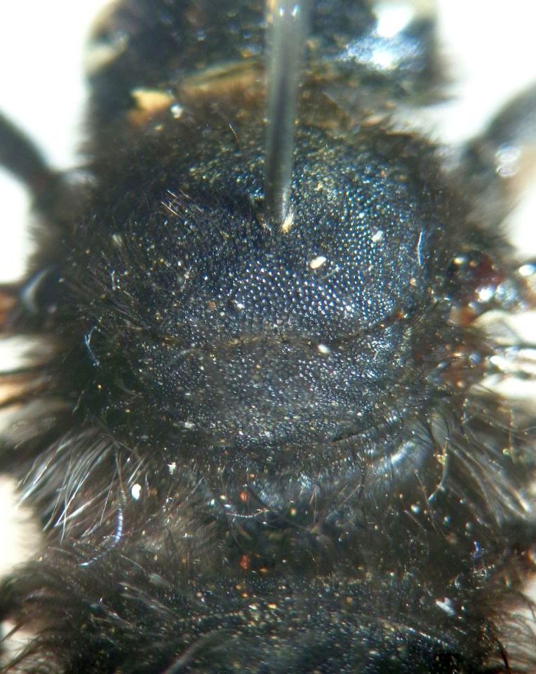Pochi minuti fa mi è capitato di determinare un esemplare pugliese assolutamente identico a questo e anche più piccolo, misurando 13mm. Ho scoperto però che non si tratta di M. parietina come avevo inizialmente pensato, ma di quella che Benoist descrisse come pyrenaica nigricans, poi rinominata benoisti da Tkalcu nel 1977 per omonimia. Il taxon, endemico di Puglia, sembra attualmente considerato di rango specifico e non come sottospecie di pyrenaica, ma purtroppo non ho il lavoro di Tkalcu che potrebbe chiarire le motivazioni di questo spostamento. Giorgio, controlla la punteggiatura di clipeo e mesoscuto del tuo esemplare: in parietina i punti sono di dimensioni uguali, mentre in benoisti quelli del mesoscuto sono evidentemente più grandi. Dalle foto mi sembra che la punteggiatura sia da benoisti, ma sicuramente puoi confrontarla meglio di persona. Giusto per scrupolo, ci sarebbe da escludere anche M. lefebvrei, che ha dimensioni simili e può presentarsi con questa stessa colorazione. Controlla il sesto sternite, in lefebvrei la zona apicale è separata dal resto della superficie da un piccolo scalino e ha una punteggiatura nettamente diversa, mentre in parietina e benoisti la superficie è omogenea. |