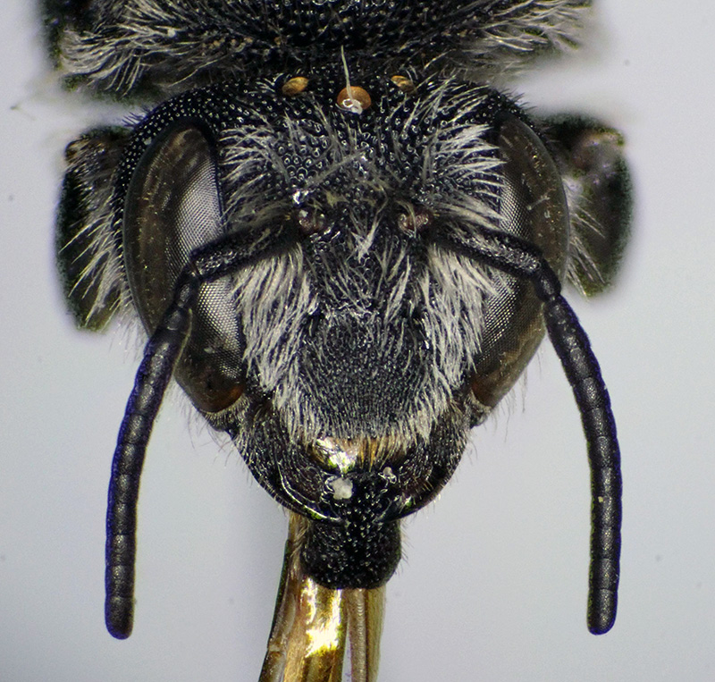 Il maschio si riconosce per la colorazione nera con l'apice di alcuni tergiti con una fascia chiara traslucida, la punteggiatura del clipeo molto più fine e densa del resto della testa, il sesto tergite con al centro degli ampi interspazi lucidi e il quarto sternite con una depressione a V nel centro.