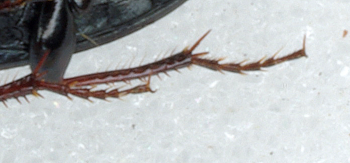 Ho ripulito, per quanto possibile la bestiaccia. Purtroppo le zampe erano molto incrostate da qualche tenace sostanza farinosa ed ho avuto qualche difficoltà; la zampa posteriore sinistra è andata distrutta  . Forse sono stato maldestro io, ma giuro che ho cercato di essere il più delicato possibile, le incrostazioni erano tenaci e l'esemplare molto vecchio (l'avevo preso nel 1979, è possibile che dopo tanto tempo diventino più fragili). Ma le altre zampe ora sono decisamente più pulite. Primo: la spazzola di setole delle zampe posteriori (ormai "zampa" posteriore) in realtà non c'è, era una striscia di incrostazioni. Questo cambia tutto, esclusa ovata. Secondo: Lo sperone delle tibie anteriori confermo che è semplice. Vi allego qualche immagine. Lato ventrale:Lato dorsale: Zampa posteriore:Tibia anteriore: