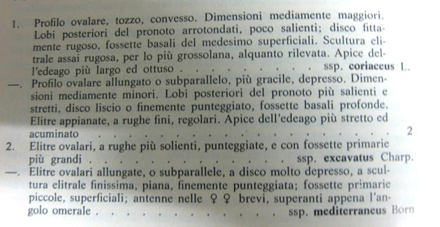 la foto fa schifo come al solito. questo è quello che scrive Casale e che sicuramente conoscerai già...non leggo riferimenti agli angoli posteriori del pronoto (probabilmente ci saranno altrove), ma soprattutto differenze di scultura elitrale. boh, non so cos'altro aggiungere se non che i miei mediterraneus (purtroppo ne ho solo un coppia) sono diversi dalla bestia proposta da ruzzpa e dai coriaceus tipici che possiedo (e sono parecchi e di varie località). se dovessi avere torto, cosa possibilissima, sarebbe corretto quanto ipotizzato da Maurizio Bollino nel suo ragionamento di cui sopra: Maurizio Bollino ha scritto: 2) l'esemplare di Gianpaolo è un coriaceus mediterraneus simile a un coriaceus coriaceus. ....................... Se, invece, è vera l'ipotesi 2, allora sembrerebbe che le due sottospecie non siano tanto ben caratterizzate da poter essere considerate distinte... ciao, ciao...azzz...oggi mi fate sudare.