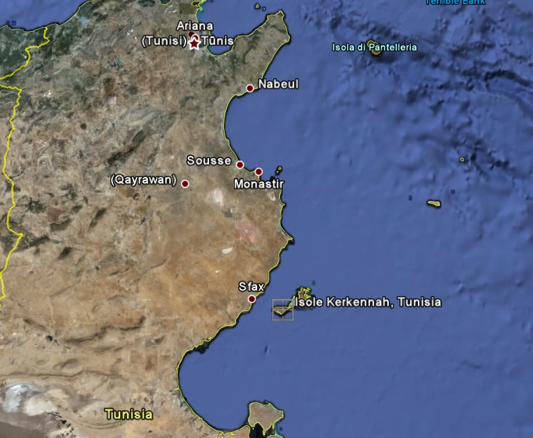 Per concludere questa interessante discussione sulla Calomera lunulata vi propongo un'ultima immagine, che mostra due esemplari, raccolti sempre in Tunisia, ma questa volta lungo le rive di un lago salato (chot o chott ?). Fanno parte di una piccola serie lasciata, purtroppo, troppo a lungo nel boccettino con l'etere, che iscurì irreversibilmente le macchie bianche elitrali Si tratta a mio avviso, in questo caso, della Calomera lunulata, sia per la scultura elitrale, che per l'ambiente dove era presente (ricordo, numerosissima). Ho fotografato insieme due esemplari che mostrano come la macchia mediana, nel punto di fusione con la marginale, sia larga nell'esemplare di destra, ma molto ristretta in quella di sinistra (come avviene nella Calomera littoralis ittoralis). Che ne pensate? cliccare per ingrandireDimensioni degli esemplari: 15 e 16 mm. Località di raccolta: Tunisia, Isole Kerkennah, 18.V.1982 L'isola che si vede a metà strada fra le Kerkennah e Pantelleria, è proprio Lampedusa (ITALIA  ) (ex stazione della specie  )