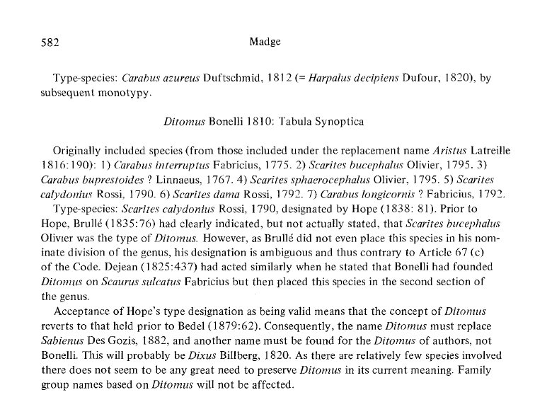 bene, mi sono sorbito e digerito con calma il tutto  ... quella di latreille non credo proprio possa costituire una designazione di specie tipo; non ho trovato da nessuna parte che sostituire un nome, omonimo o presunto tale, di un taxon del livello genere con un altro equivalga a fissare la specie tipo del secondo come specie tipo del primo, anzi il codice dice espressamente che se due taxa del livello genere vengono posti in sinonimia, le loro specie tipo restano le stesse brullé, da parte sua, cita chiaramente (pur senza nominarla) la specie che a suo dire è servita da tipo ai "Ditomes", ma poi si contraddice, dividendo il gruppo in "Ditomes proprement dits" et "Aristes" (anche se per questi ultimi usa il nome generico Ditomus), in pratica (anche se non formalmente) trattando i secondi come un sottogenere dei primi, e quindi apparentemente non concordando sul fatto che lo " Scaurus sulcatus" vada considerato la specie tipica invece la designazione di dejean mi dà l'aria di essere valida: è vero che divide i Ditomus in due gruppi, assegnando il clypeatus al secondo, ma non ho trovato nessun accenno al fatto che lui considerasse i primi come i "Ditomi veri" o "propriamente detti"; si limita a segnalare che la prima divisione corrisponde a quelli che ziegler aveva considerato Ditomus, e la seconda a quelli che lo stesso aveva chiamato Aristus (ad es., non scrive niente del tipo "2ème division - Aristus"); incidentalmente, criticando il fatto che, benché il genere fosse poco numeroso, ziegler avesse creduto opportuno dividerlo nei due generi citati di conseguenza, a mio parere  , l'affermazione che "il genere è stato fondato da bonelli, sullo Scaurus sulcatus, e su alcune altre specie..." (non nominate) costituisce una fissazione valida di Scaurus sulcatus (= Scarites clypeatus) come specie tipo di Ditomusa voi le repliche  ...