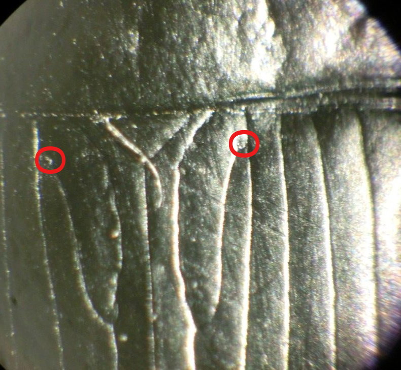 Mi è venuto un dubbio atroce... Prima di guardarla al microscopio l'ho pulito con un pennello abbastanza rigido...