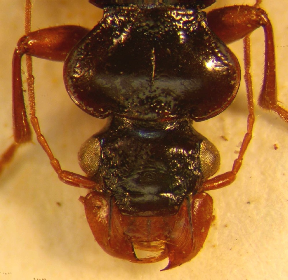 non avevo indicato quel carattere perché non sempre di agevole osservazione: talora esemplari catturati con trappole a caduta innescate con liquidi inadatti possono risultare irrigiditi e quindi con mandibole inapribili, e allora sono c...asi in cui conviene accontentarsi delle tempie :D