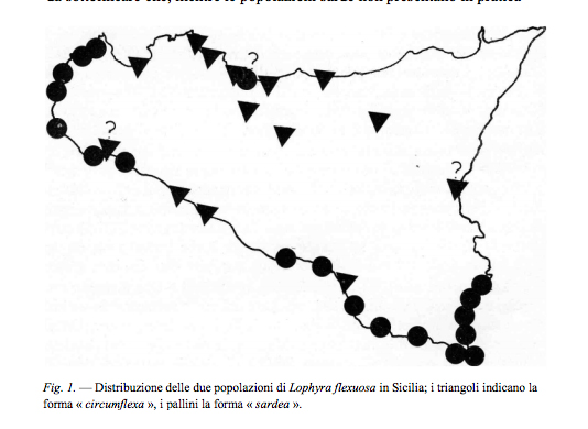Partendo entrambi dalla constatazione che in Sicilia sono presenti "a macchia di leopardo", come scrive Maurizio, (vedi figura 1 tratta dal lavoro di Aliquò) alcune popolazioni di Lophyra flexuosa Fabr. aventi caratteri pressocché identici alla ssp. sardea Dej., accanto a popolazioni caratterizzabili come circumflexa Dej., giunsero però a conclusioni, o meglio a ipotesi, opposte.