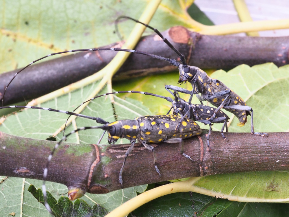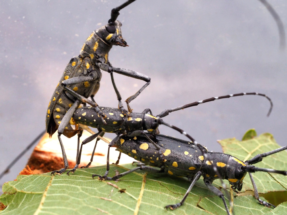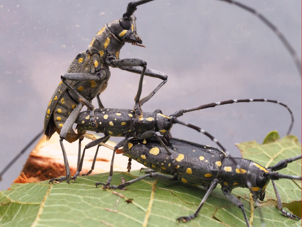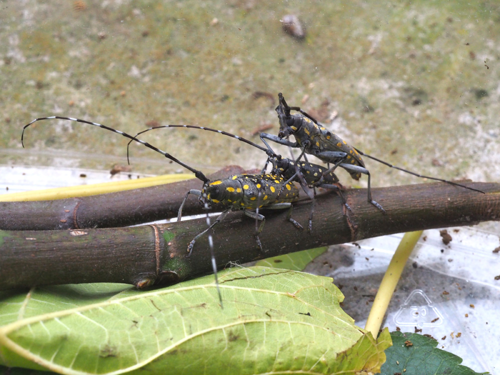 Purtoppo la larva n 2, presumibilmente di Psacothea hilaris non è riuscita a compiere la trasformazione. Resta ancora in vita la larva n 1, non so per quanto tempo. In questi giorni sono riuscita a catturare 2 esemplari: due maschi - pensavo - di cui uno piccolissimo, circa 1, 5 cm con macchie per lo più biancastre. A questi due ne ho aggiunto proprio oggi altri due. Anche questa volta ho presunto fossero maschi. Nel primo pomeriggio ho constatato che l’esemplare più piccolo cercava di accoppiarsi ad uno dei nuovi inquilini. Con grande soddisfazione ho immortalato l’evento. Ad un certo punto alla coppia si è aggiunto un terzo esemplare con il quale è avvenuto il primo accoppiamento, ripetuto e continuo. Trasmetto le foto del primo evento. Silviana