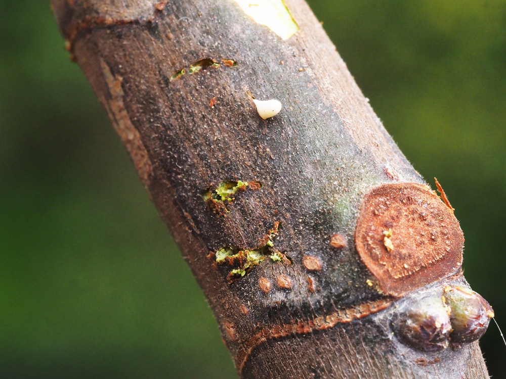 L'ultima osservazione, poi mi eclisso, almeno per un po'. Le coppie ora si sono stabilizzate: n. 1 con n. 2 e n. 3 con n. 4.Ieri, sul tardi, la femmina 4 ha inciso nella scorza di un ramo il suo uovo (primo e ultimo?). Non l'ho osservata per tutto il tempo, ma il maschio, in questa attività, la sormontava, probabilmente per aiutarla. Nel ramo, in cui ha inciso l'uovo, si vedono molto bene i morsi delle mandibole (?) della femmina e forse anche quelle del maschio. Mi scuso ancora per il pasticciaccio. Silviana