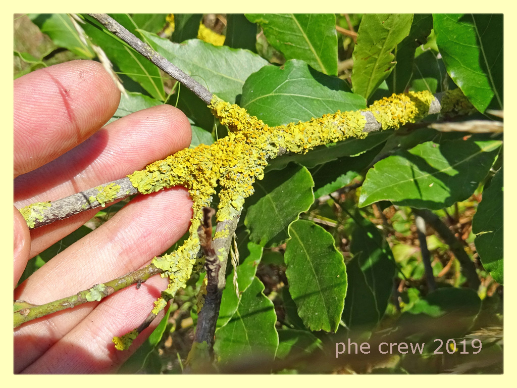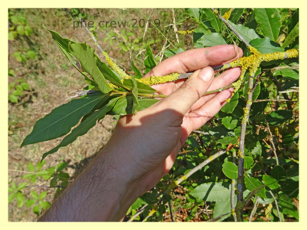 Salve a tutti, oggi 6.7.2019 sono andato a fare delle foto nel solito biotopo e indovinate cosa mi trovo davanti ? ...dei rametti del presunto Alloro attaccato da licheni. Non e' lo stesso tronco e rami delle foto qui sopra ma stavano li vicino. Dato che Augusto diceva di non aver visto mai un Alloro attaccato da licheni ho subito fatto delle foto. Dunque o e' Alloro o un arbusto della stessa famiglia...boh :?