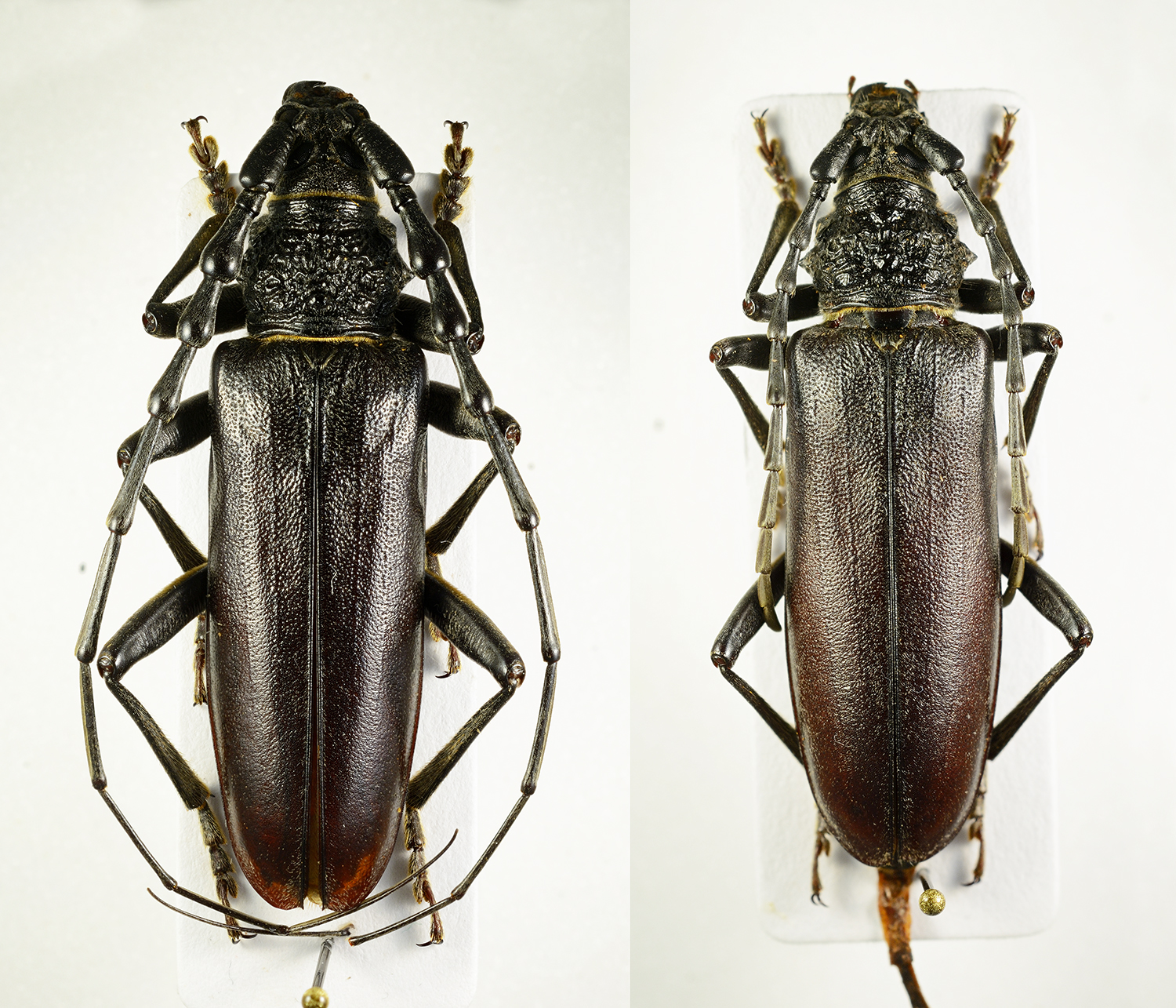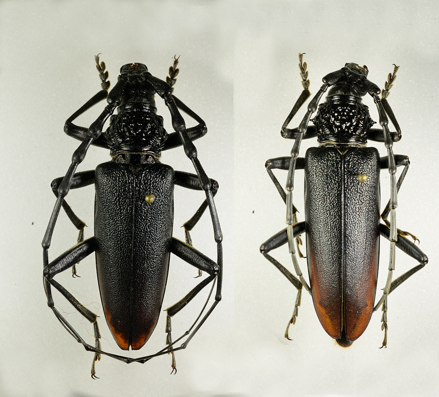 Visto che a quanto pare è un genere ostico, metto una chiave per le specie europee del genere Cerambyx con le foto come veniva suggerito. Le foto sono fatte senza troppi amenicoli, a scopo scientifico, non ho unformato lo sfondo a tutte e curato troppo la luce, però secondo me sono molto chiare. Prima che qualcuno commenti che non sono tutte le specie di Cerambyx anticipo dicendo che ci sarebbe, piuttosto raro, anche il Cerambyx dux in Bulgaria e Macedonia, però non ce l'ho in collezione, quindi non sapevo come fare la foto!  Ce ne sono sul forum ma di identificazione dubbia e quindi ho preferito aspettare a metterle. Inserisco di nuovo la chiave che già avevo scritto in un'altra discussione allegando quindi le foto e i particolari anatomici descritti in modo comparativo (più avanti quando ho finito i disegni). La metto qui così è più visibile e se qualcuno ha suggerimenti da fare per migliorare la chiave può farli. 1 Elitre con tegumenti completamente neri e lucidi..................... scopoli Fuessly - elitre con tegumenti almeno in parte rossastri, alle volte con pubescenza argentata.....2 2 elitre e pronoto con pubescenza argentata, pronoto spesso non completamente nero ma leggermente rossastro, elitre con colorazione rossastra più estesa.................3 - elitre e pronoto senza pubescenza argentata, pronoto completamente nero, elitre con colorazione rossastra meno estesa ..............4 3 secondo articolo antennale almeno il doppio più largo che lungo, schiacciato............. carinatus Küster - secondo articolo antennale decisamente più lungo che largo.......................................welensii Küster 4 antenne nel maschio molto più lunghe del corpo, con articoli non molto globosi, apice elitrale con evidente spina………….. cerdo Linnaeus - antenne nel maschio di poco più lunghe del corpo, con articoli più globosi, apice elitrale senza spina……………5 5 elitre dall’aspetto sericeo o comunque non lucido, scultura elitrale mediamente meno rilevata, le antenne possono presentare, soprattutto nella femmina, una pubescenza argentata, pronoto senza una zona centrale liscia e con pieghe poco rilevate che possono essere disposte in serie longitudinali………………6 - elitre decisamente lucide, con scultura mediamente più rilevata, pronoto spesso con una zona centrale liscia e molto più corrugato senza pieghe longitudinali………………. nodulosus Germar 6 occhi di dimensioni maggiori, la parte inferiore raggiunge il bordo inferiore della testa........... dux Faldermann - occhi di dimensioni minori, la parte inferiore non raggiunge il bordo inferiore dell testa.......... miles Bonelli