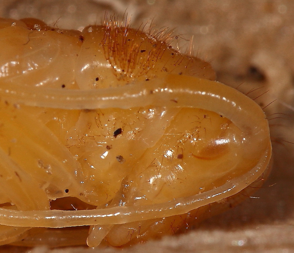 Da notare le spine sugli ultimi segmenti adominali, e i lunghi peli su torace e capo. Suppongo i primi servano per muoversi all’interno della galleria.
