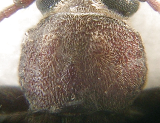 Cominciamo dalle elitre, che sono di colore scuro uniforme e coperte a chiazze da una corta pubescenza gialliccia.