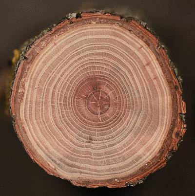 Qui una sezione di un tronchetto di olmo da 7 cm con evidenti traccie subcorticole di Saperda punctata (rosso) e Lamprodila (verde)
