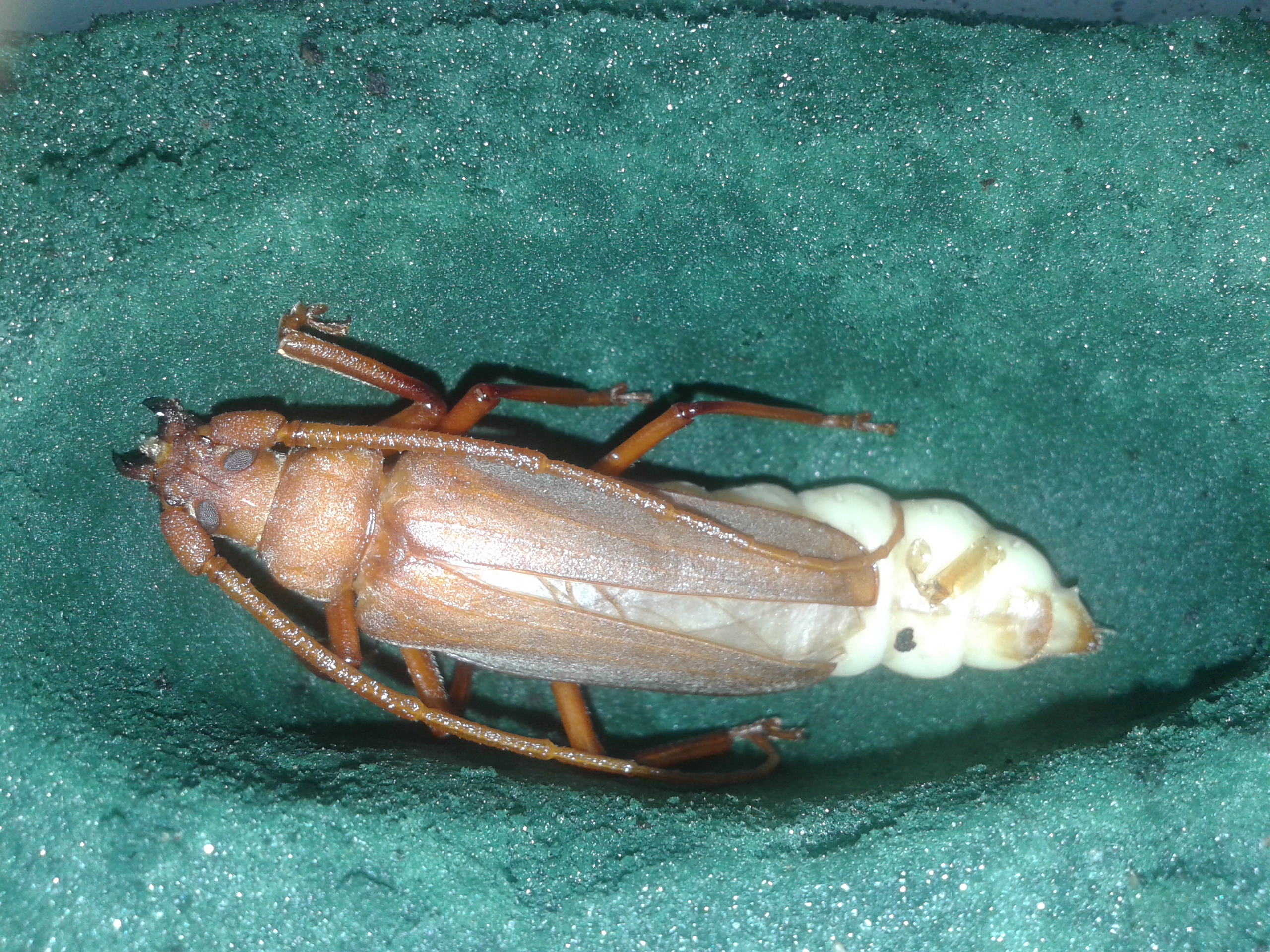 Le larve che avevo accidentalmente fatto uscire dalle gallerie le ho messe in legno compatto per farle maturare e far fare la celletta poi da prepupe le ho spostate in spugna. Si sono impupate i primi di aprile e questa notte verso le 3.30 (l'ora la so perché mi alzavo per andare a lavorare... :oooner: ) è comparso il primo adulto.