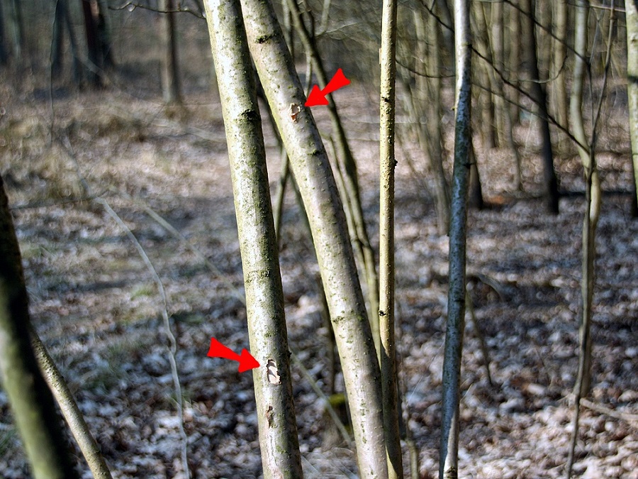 R. macropus - red arrows indicate larval gallery; Polska, Warszawa, Las Kabacki, 24 III 2015