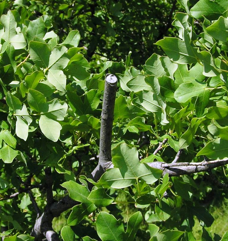 Cut branch, stump of the twig, visible on the bush of Acer monspessulanum