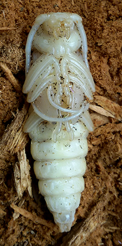 Sicuramente si può tenerlo in vita fino alla schiusa, mettilo in un recipiente con un coperchio forato per la circolazione dell'aria, e lo copri con la rosura che hai raccolto tenendola leggermente umida, non mettergli pesi sopra tipo pezzi di legno o altro, al massimo un pezzetto di corteccia, perchè in questa fase è molto delicato e può darsi che un peso eccessivo gli comprometta lo sviluppo normale delle elitre che restano in questo caso atrofizzate. Non disturbarlo più di tanto, non credo che ci vorrà molto alla schiusa al massimo un mese. Ti ho detto questo in base alle mie esperienze, che mi hanno dato quasi sempre ottimi risultati. In bocca al lupo Giuseppe